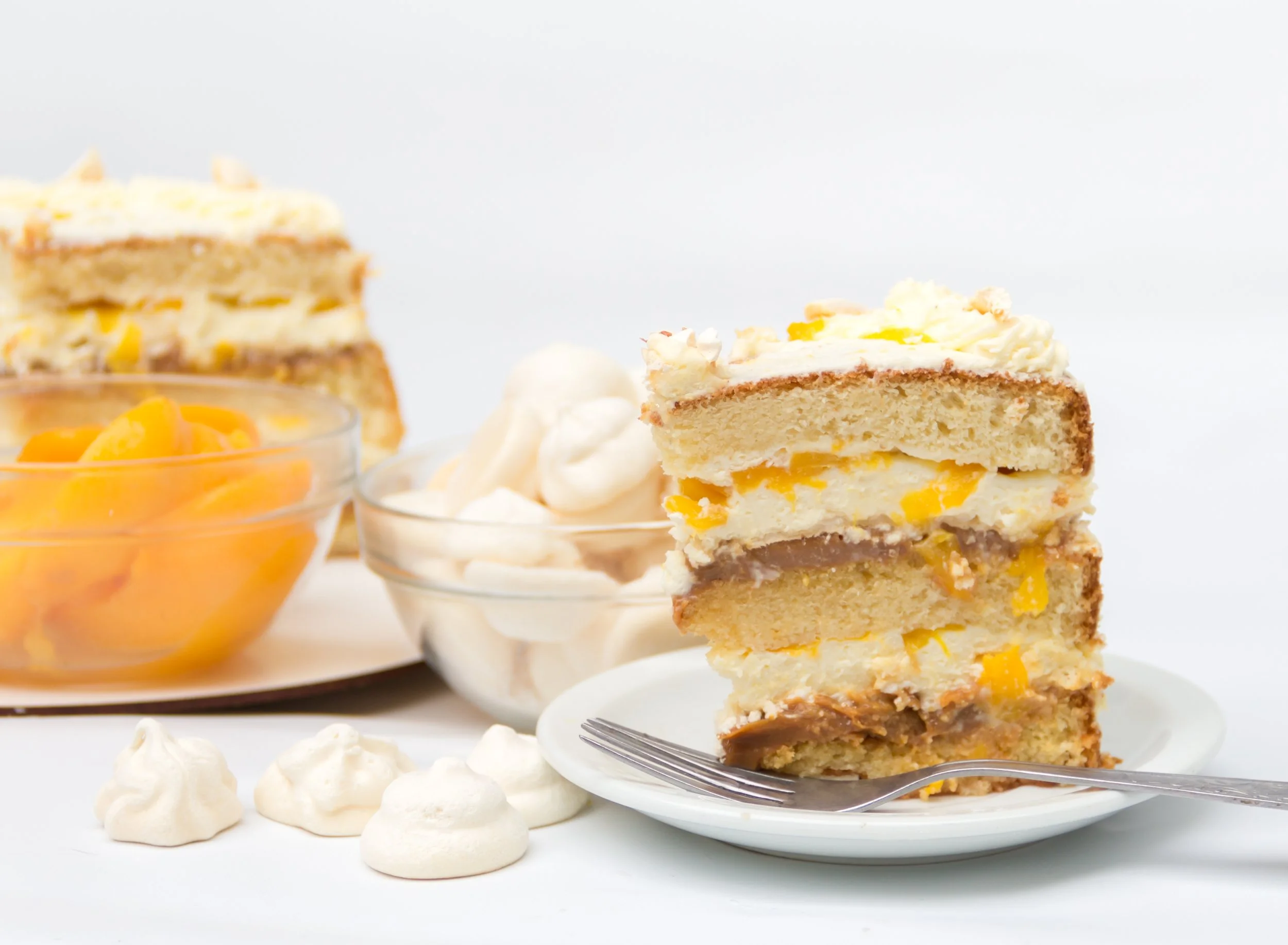 Dulce de leche, peaches, whipped cream, and meringue fill layers of soft vanilla sponge cake.