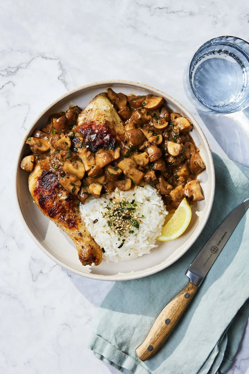 - Plate: Serve chicken with a mound of rice. Spoon mushroom sauce over top. Garnish with lemon, scallions, and furikake if desired.