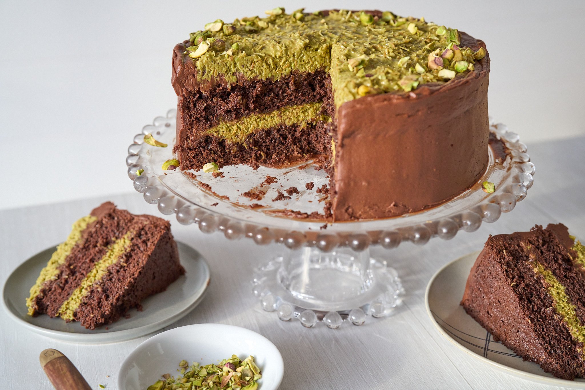 A decadent chocolate cake layered with pistachio-tahini kataifi and finished with a billowy chocolate cloud frosting. Toasted kataifi, or phyllo dough strands, bring a satisfying crunch and Mighty Sesame tahini and toasted pistachios deliver a complex nuttiness.