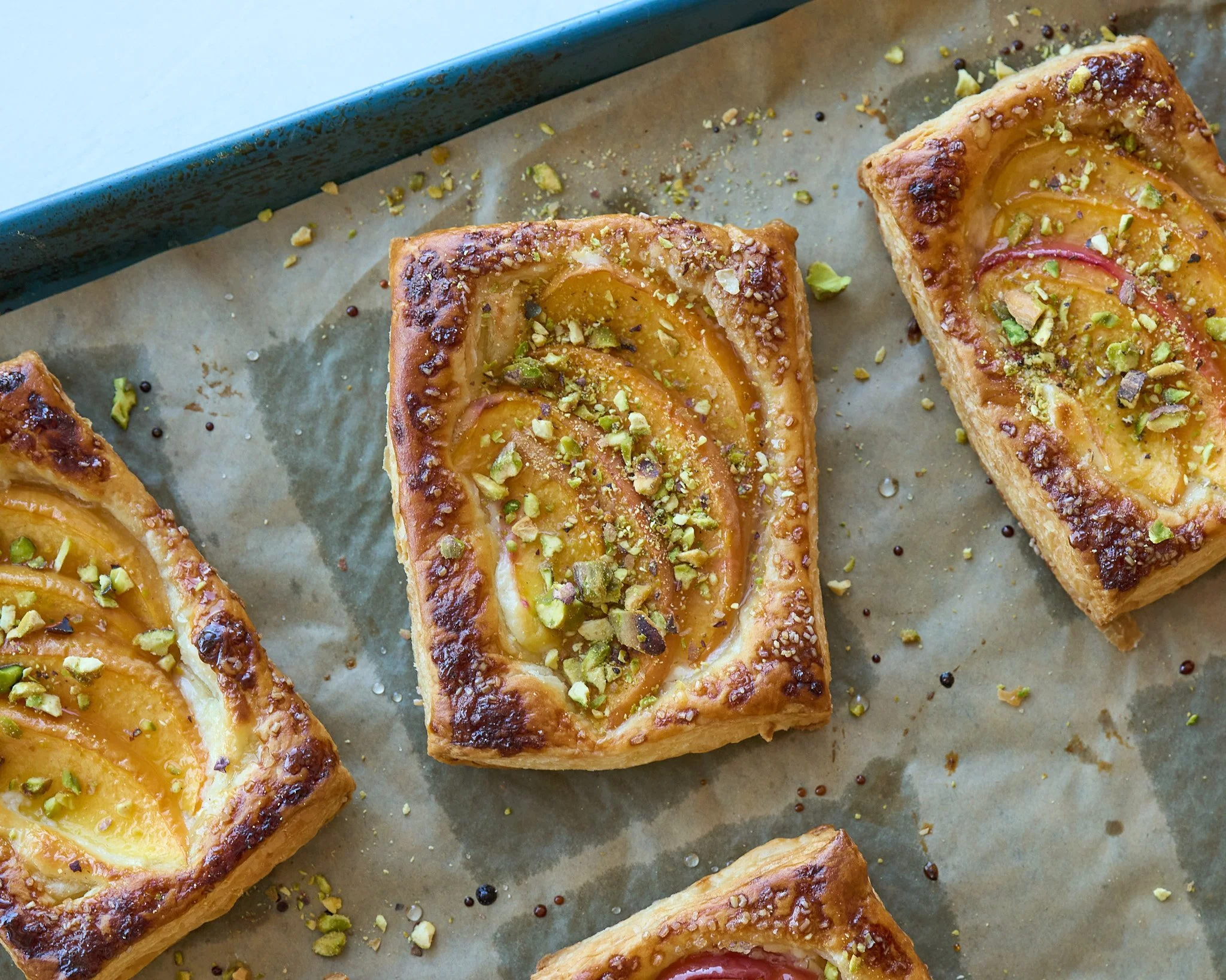 - Glaze the Pastries: Immediately after baking, glaze the peaches with the syrup. Sprinkle with chopped pistachios. Serve warm or at room temperature.