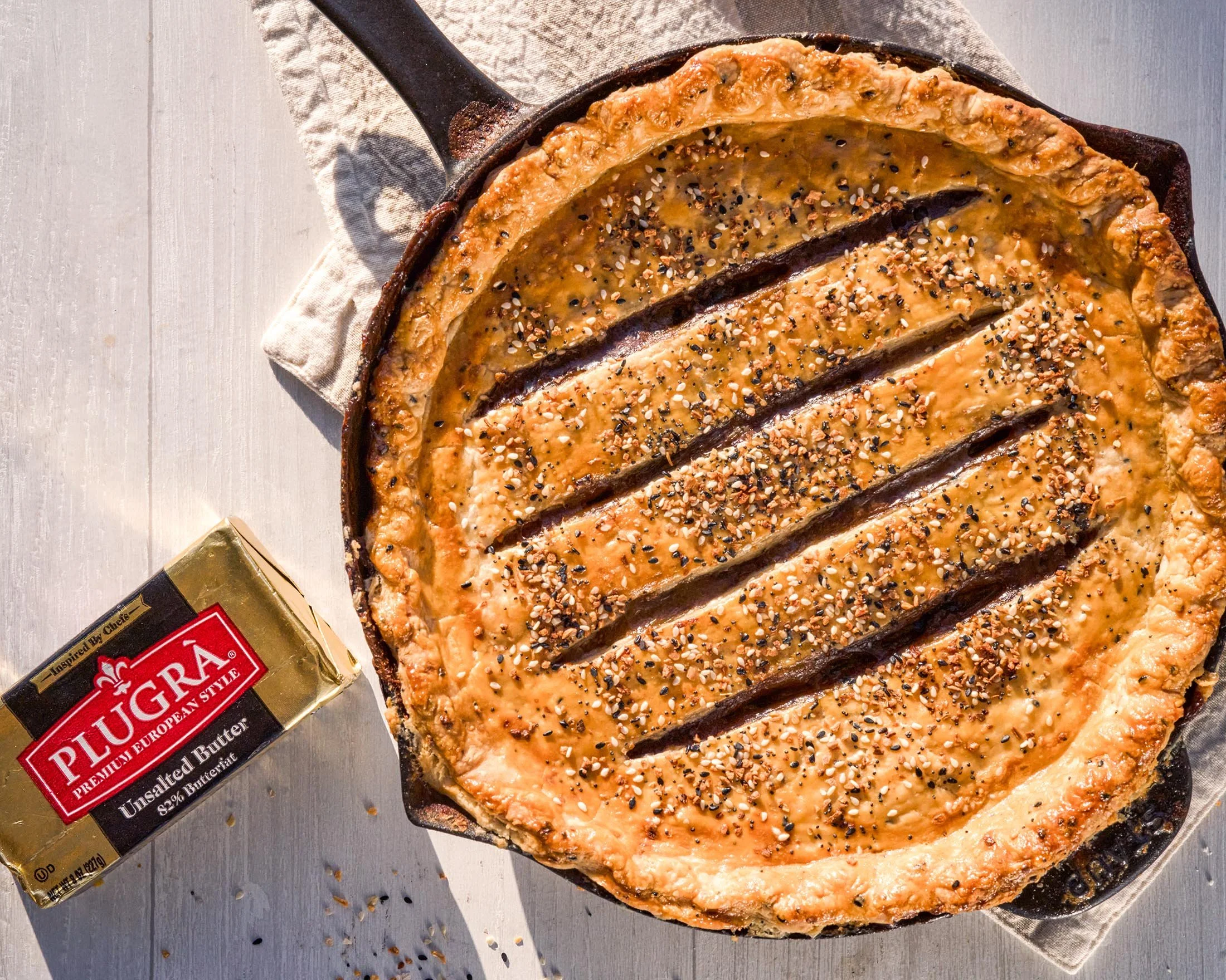 - Top with Pie Dough: Roll out dough to fit skillet. Place over filling, press edges to seal, cut steam vents, brush with egg wash, and sprinkle with seasoning.