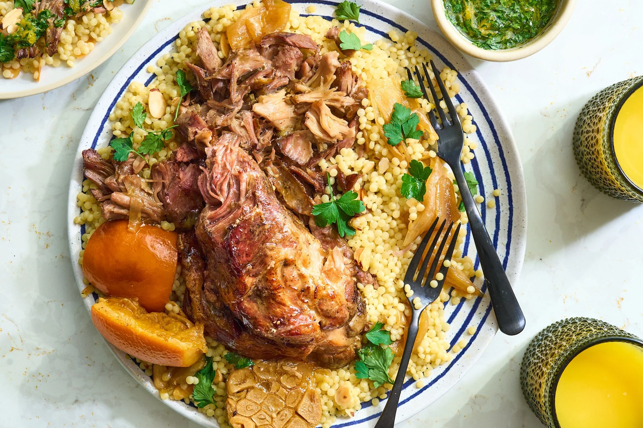 Orange juice does triple duty here: it tenderizes the pork, reduces into a glossy, citrusy braising liquid, and punches up an herb sauce for a bright finish. Serve over savory, almond-studded pearl couscous for a stunning centerpiece, then pile leftovers onto sandwiches with garlicky aioli and greens.