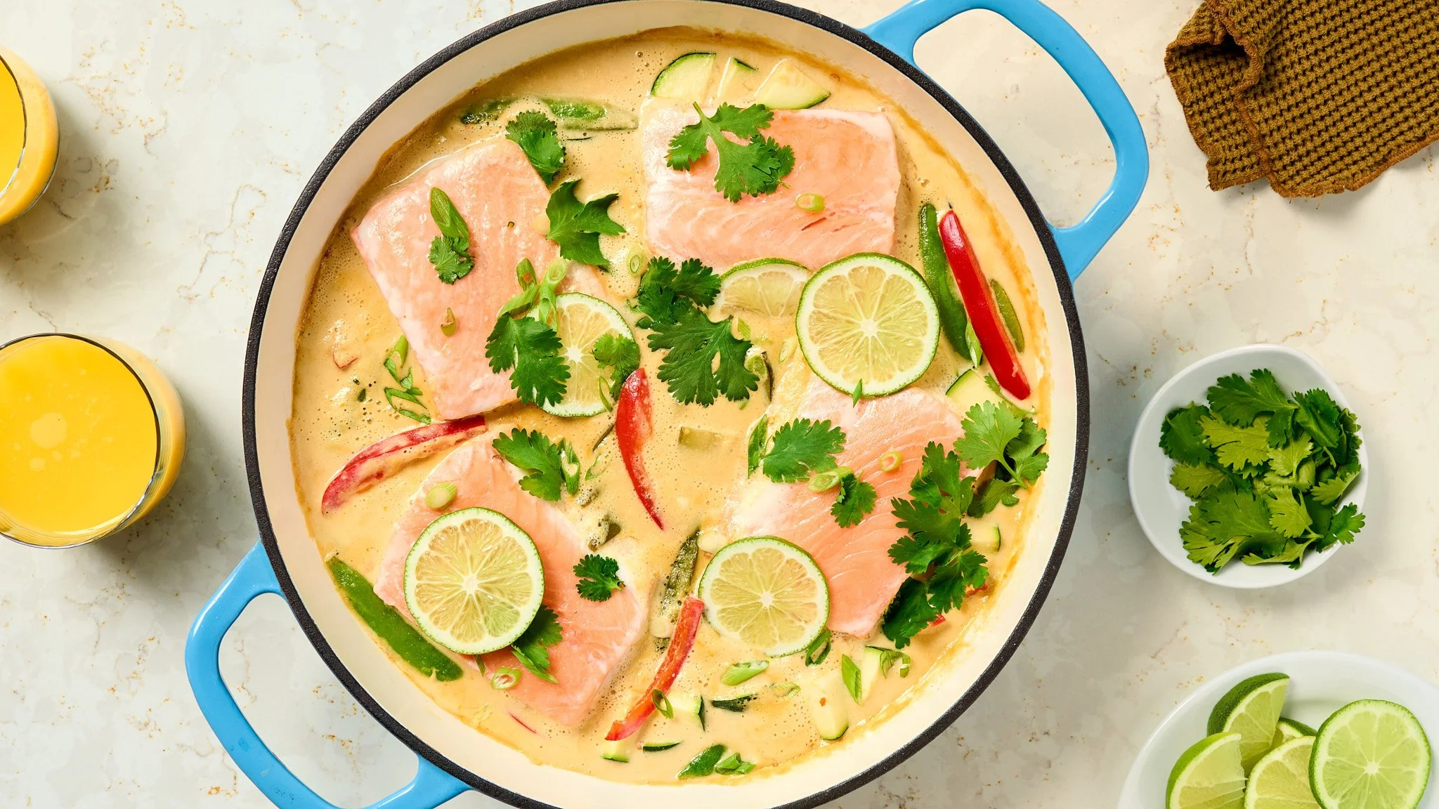 A quick, one-pan salmon situation that feels way fancier than it is. The broth is a mix of Florida orange juice, coconut milk, and ginger that gently poaches salmon right alongside the vegetables. Serve it over rice or noodles and call it dinner.