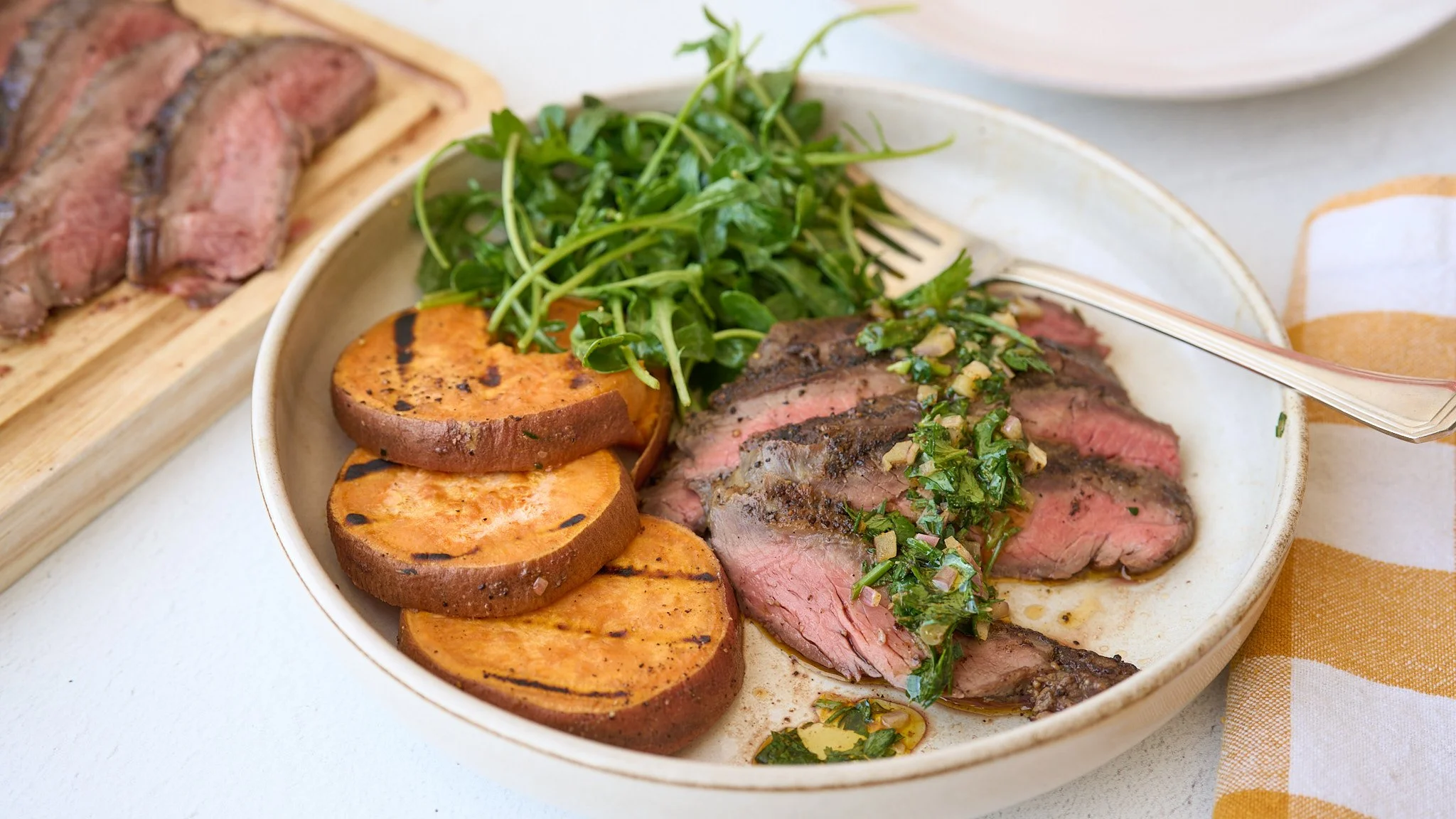 Chermoula, a zesty North African herb sauce with garlic, spices, and lemon, cuts through smoky grilled steak and sweet potatoes. Serve with a quick arugula salad now, then repurpose leftovers into Steak & Sweet Potato Bowls later in the week. Cook Once, Eat Twice magic.